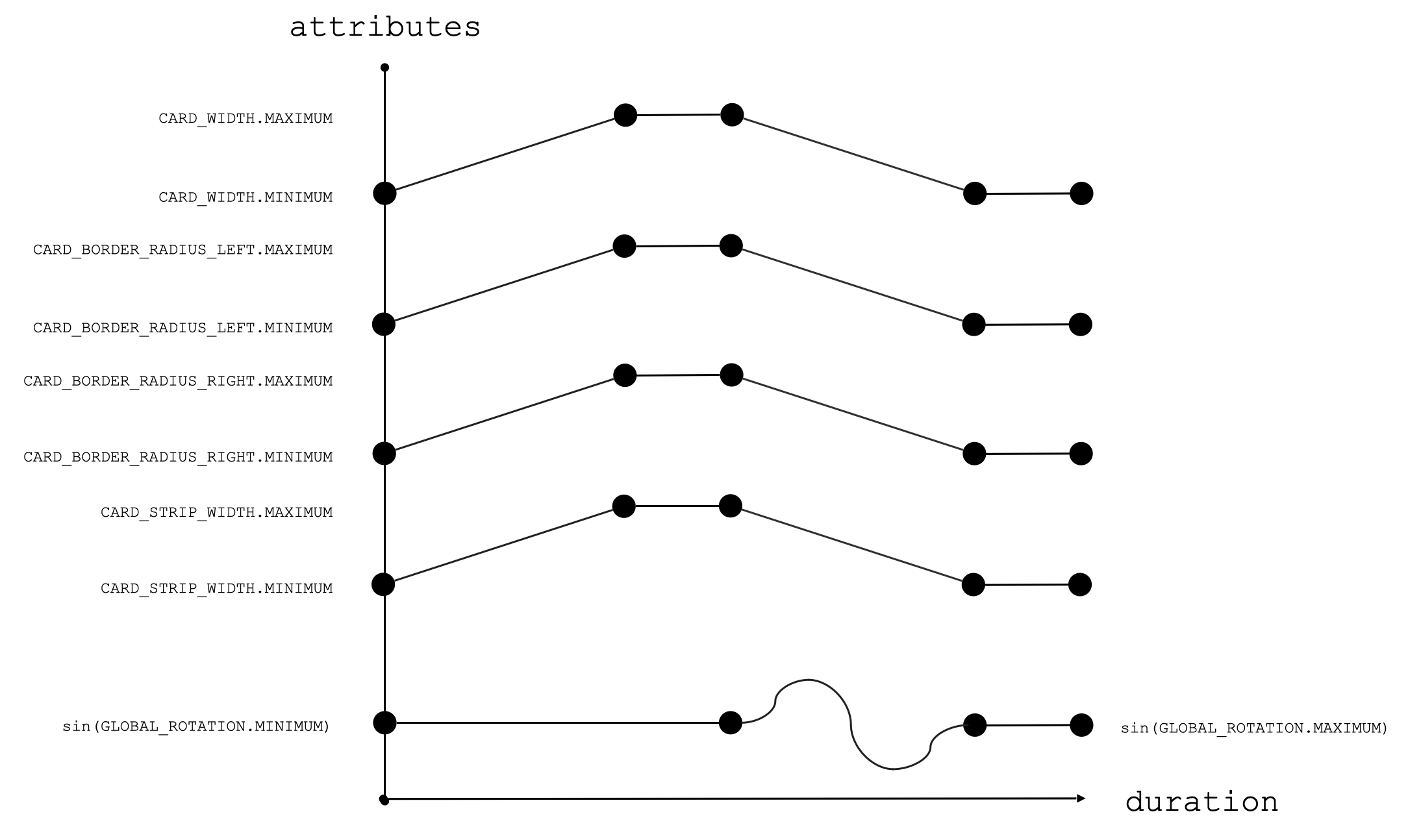 takes in a list of the behaviors of values over time – i.e. changes in values over time (Animated.timing) and constants values over time (Animated.delay) that occur one after another (sequentially). The goal is to create a continuous path.